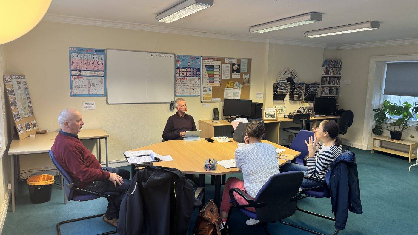 Topics range from travel and work to Scottish culture, food and weekend plans. For many students, this relaxed conversation is where confidence really begins to grow.
